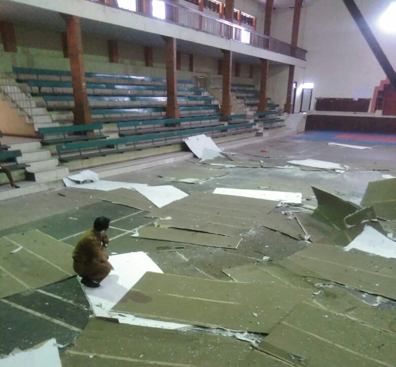 JUARAMEDIA COM, PANDEGLANG – Atap plafon gedung Gelanggang Olah Raga (GOR) Pancasila Pandeglang ambrol, Senin (06/01/20) pukul 03 00 WIB.