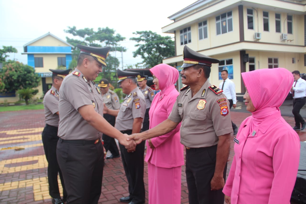 Kapolres Lebak saat memberikan ucapan selamat kepada anggota yang melaksanakan Korps Raport Kenaikan Pangkat Pengabdian TMT 01 Februari 2020, AIPTU Suwadi PS Kanit 2 Binmas Polsek Maja Polres Lebak (AIPTU ke IPDA)