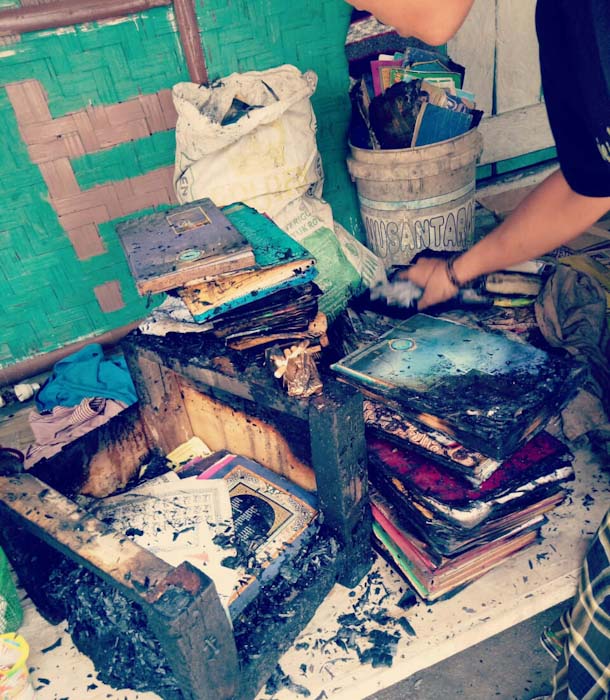 “3 kamar atau kobong santri yang terbuat dari material bahan kayu dan bambu habis dilalap api, rata dengan tanah, juga puluhan kitab terbakar,” kata Madyana, salah seorang warga kampung setempat kepada media, Sabtu (19/9/2020).