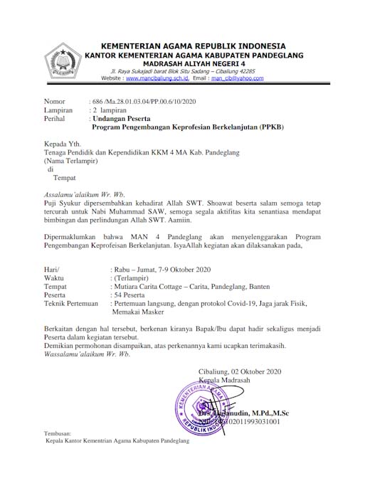 Sementara Kepala Kemenag Kabupaten Pandeglang, Drs H. Endang, MAg saat dikonfirmasi belum bisa memberikan keterangan. Dari informasi yang diperoleh acara PPKB MA Cibaliung itu akan dilaksanakan selama 3 hari dari Rabu – Jumat (07-09/10/20) di hotel mutiara Carita.(dni)