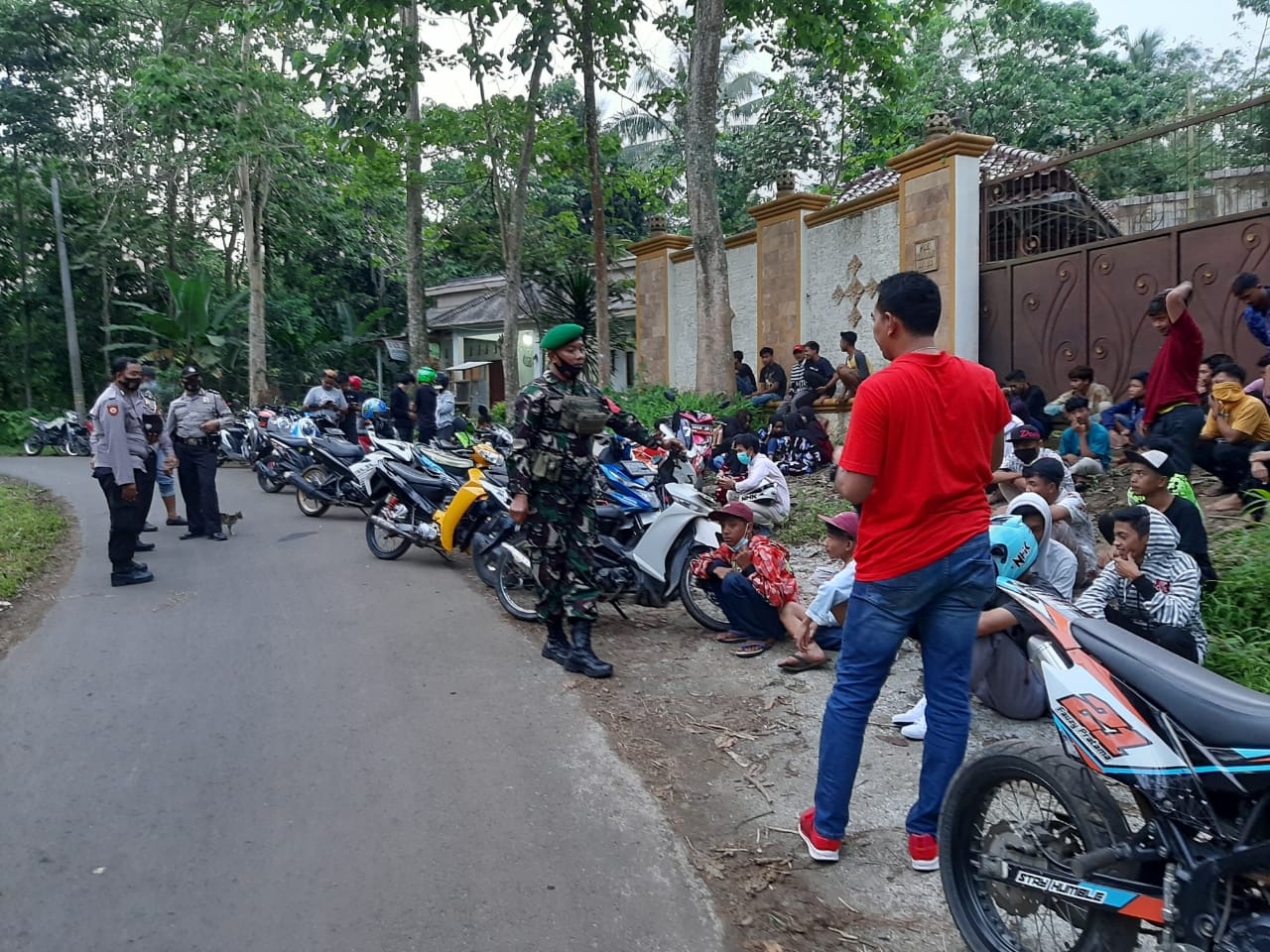 Caption : Sekelompok remaja yang tengah menonton aksi balapan liar di area Stadion Badak Pandeglang, tidak bisa berkutik saat didatangi Jajaran Polsek dan Koramil Kota Pandeglang.