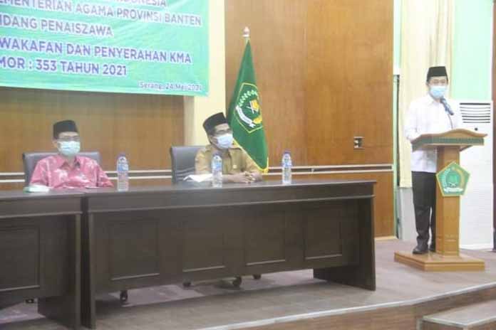 JUARAMEDIA.COM – Kepala Wilayah Kementrian Agama Provinsi Banten memberikan pemahaman tentang pembinaan kewakafan dan sekaligus penyerahan Keputusan Mentei Agama (KMA) Nomor 353 tentang izin tukar menukar harta benda wakaf.