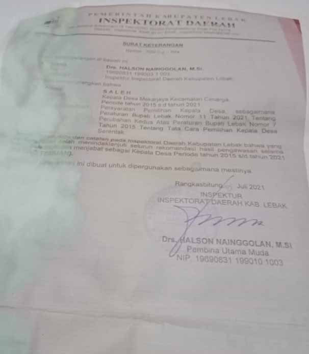 Heru, Tokoh Pemuda Kampung llham Jaya Desa Mekar Jaya Kecamatan Cimarga Kabupaten Lebak, dengan ini menyampaikan,bahwa benar pada hari Senin 27 Juli 2021, saya beserta perwakilan masyarakat mendatangi kantor inspektorat Kabupaten Lebak, untuk menyampaikan surat pengaduan,terkait keluarnya surat keterangan bebas temuan untuk Kepala Desa Incumbent Saleh, untuk salah satu persyaratan dalam pencalonan pilkades.