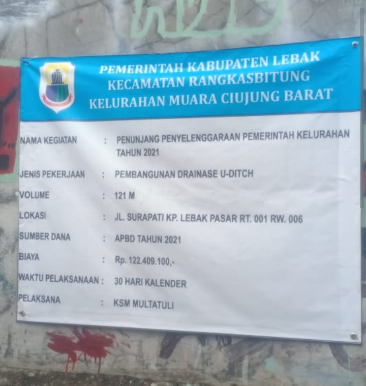 Sementara itu, Brur (55) Bendahara KSM Multatuli kampung Lebak Pasar mengatakan pembangunan drainase sepanjang 121 meter lebar 40 meter dan panjang Udich 120 cm, pagu anggaran Rp 122.409.100 APBD tahun 2021 dikerjakan sejak Desember lalu saat ini pekerjaan hampir rampung.