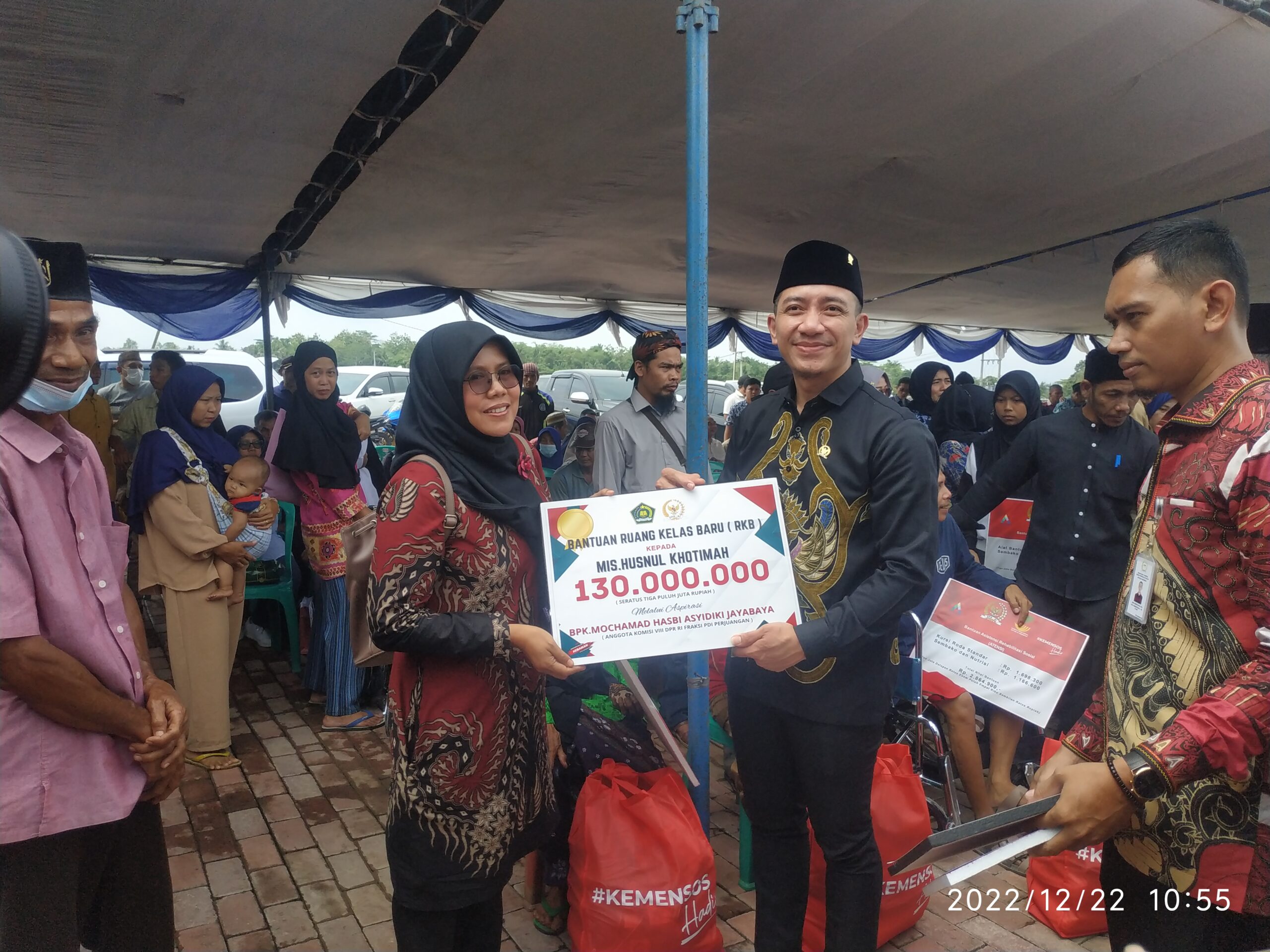 Caption : Anggota DPR RI Komisi VIII Mochamad Hasbi Asyidiki Jayabaya tengah menyerahkan Bansos dari Kementerian Sosial RI kepada salah seorang penerima manfaat.
