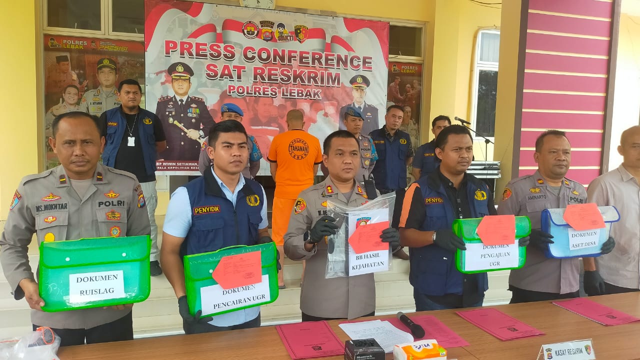 Dalam Press Conference Sat Reskrim Polres Lebak yang dihadiri oleh Kapolres Lebak Polda Banten AKBP Wiwin Setiawan, S.I.K., M.H. didampingi Kasat Reskrim Polres Lebak Iptu Andi Kurniady Eka Setyabudi, S.T.K., S.I.K., KBO Sat Reskrim Polres Lebak Iptu Mulyadi, Kasie Humas Polres Lebak Iptu Aminarto dan Kanit Tipikor Sat Reskrim Polres Lebak Ipda Putu Ari Sanjaya, S.Tr.K.
