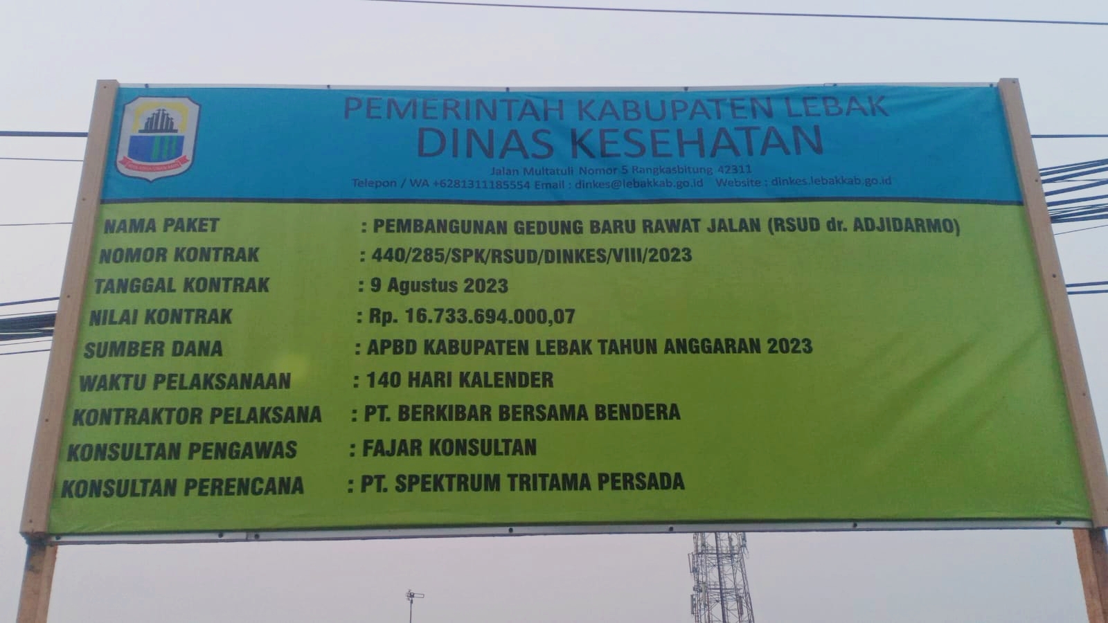 Saat ini, pembangun gedung dua lantai dan berdasarkan papan proyek pembangunan gedung itu, dana untuk pembangunan gedungnya , menelan dana Rp 16.733.694.000,07, dan di kerjakan oleh pihak ketiga PT Berkibar Bendera Bersama serta waktu pelaksanaan selama 140 hari kalender dan Anggarannya bersumber dari APBD II Lebak TA 2023 melalui Dinas Kesehatan Kabupaten Lebak itu,saat ini tengah dalam proses pengerjaan awal.