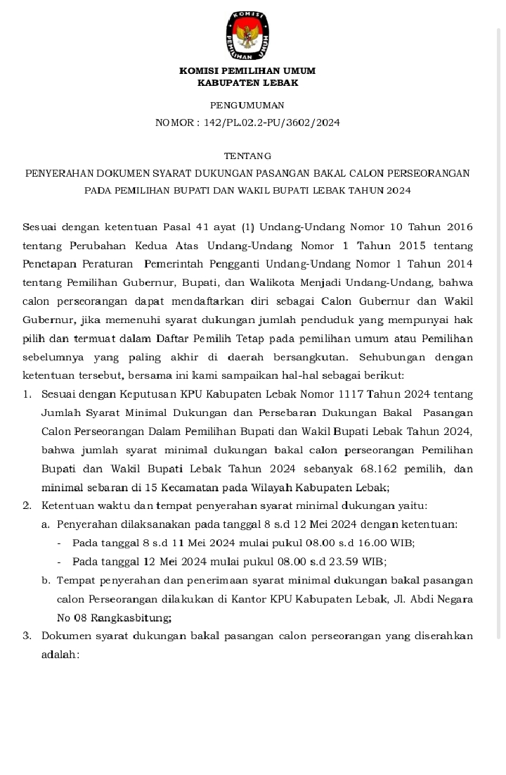 JUARAMEDIA, LEBAK – Bakal calon bupati (bacabup) yang akan maju di Pilkada Lebak 2024 melalui jalur perseorangan harus memenuhi jumlah syarat minimal dan sebaran dukungan.