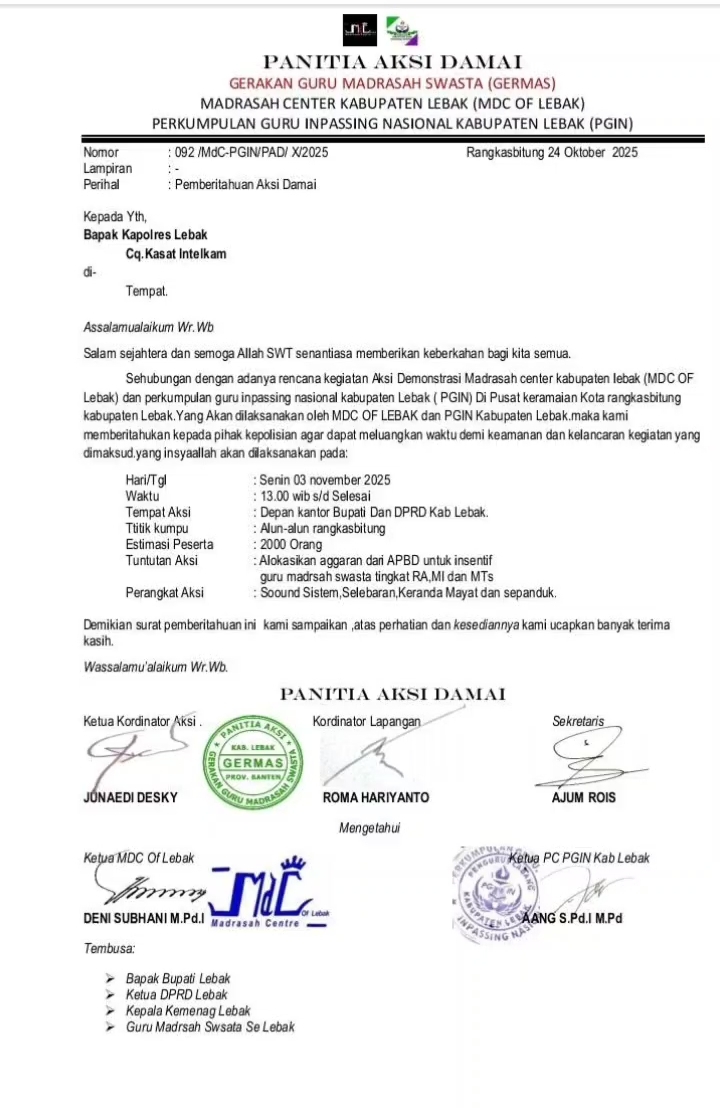 Dalam surat tersebut disebutkan, aksi damai akan dimulai pukul 13.00 WIB hingga selesai, dengan titik kumpul di Alun-Alun Rangkasbitung sebelum bergerak menuju depan Kantor Bupati dan DPRD Kabupaten Lebak.
