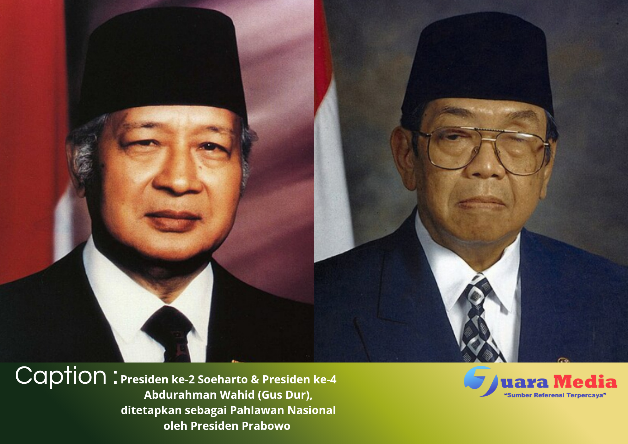 JUARAMEDIA, JAKARTA — Presiden Prabowo Subianto resmi menganugerahkan gelar Pahlawan Nasional kepada 10 tokoh bangsa, termasuk dua mantan presiden — Soeharto dan Abdurrahman Wahid (Gus Dur). Penganugerahan berlangsung di Istana Negara, Jakarta, Senin (10/11/2025), bertepatan dengan peringatan Hari Pahlawan Nasional.