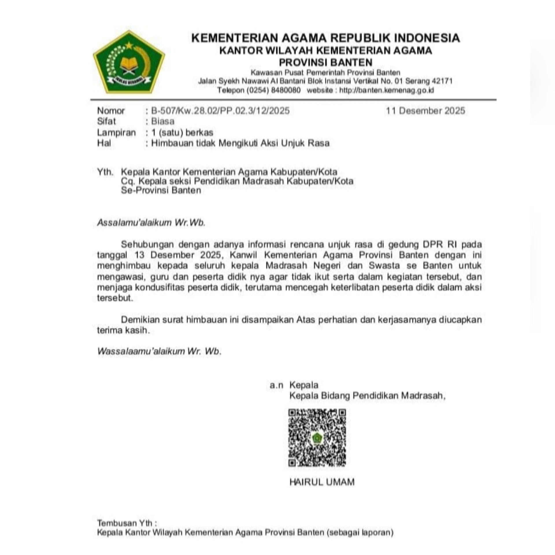 JUARAMEDIA, BANTEN — Menjelang rencana aksi unjuk rasa di Gedung DPR RI pada 13 Desember 2025, Kantor Wilayah Kementerian Agama (Kanwil Kemenag) Provinsi Banten menerbitkan surat edaran berisi imbauan tegas agar siswa madrasah tidak ikut aksi tersebut.