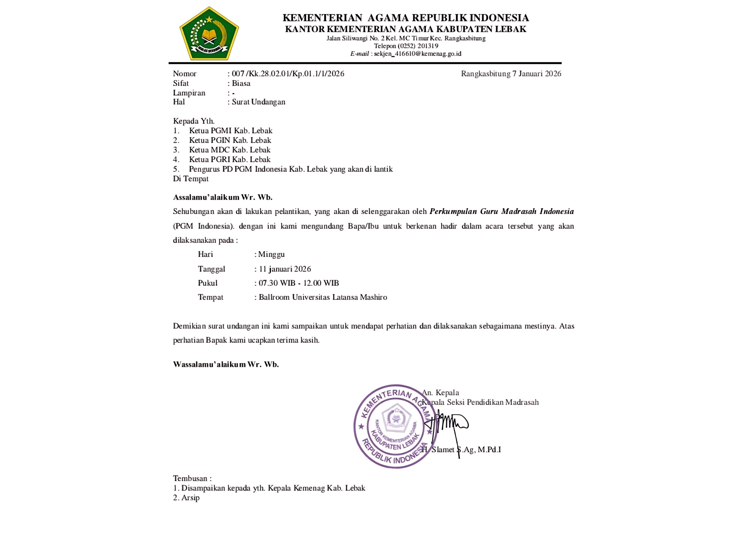 Caption : Kop Surat Kemenag Lebak pada  Undangan Pelantikan PGM yang Menjadi Sorotan
