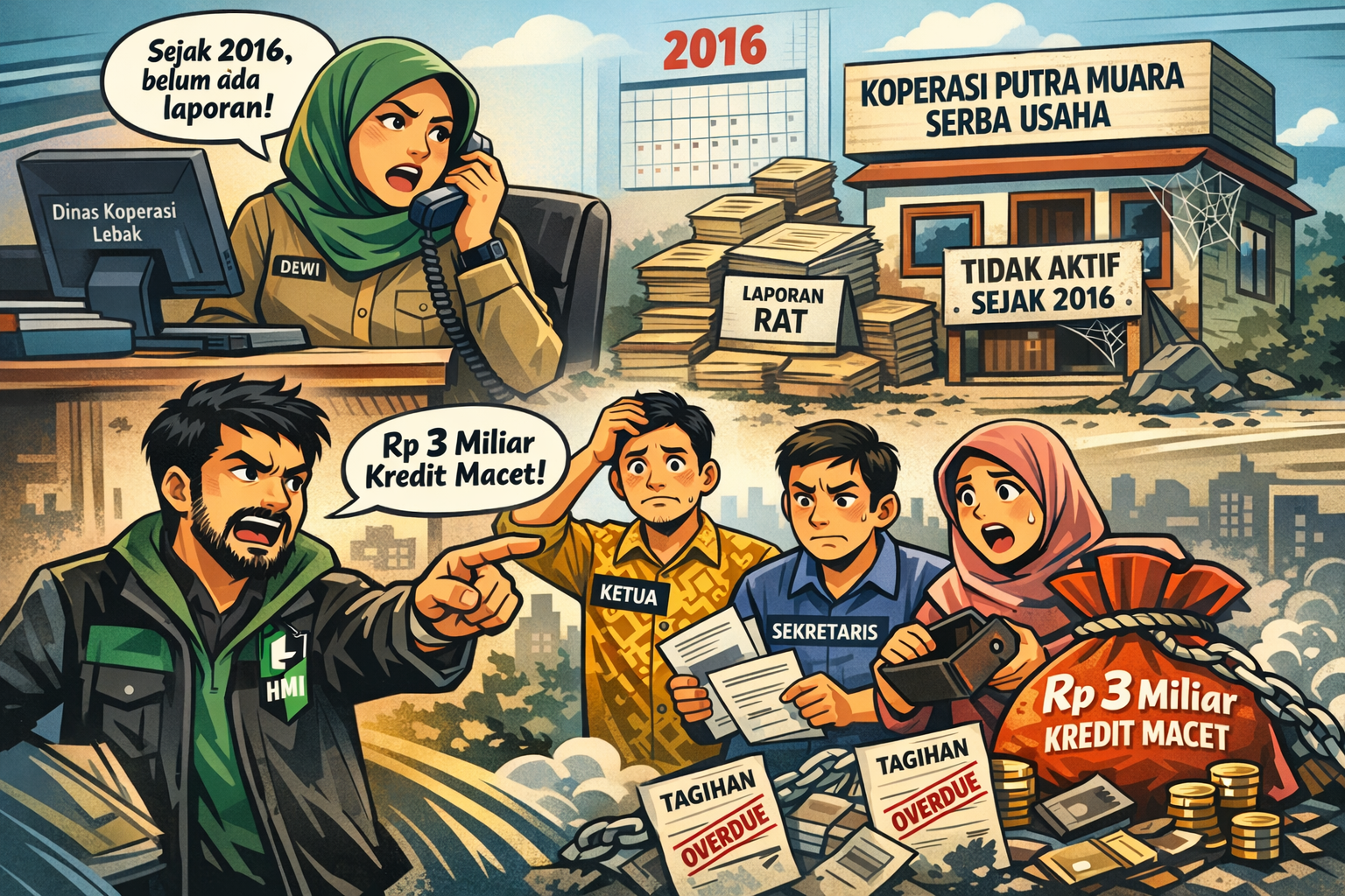 JUARAMEDIA, LEBAK – Kasus kredit macet senilai Rp3 miliar yang melibatkan Koperasi Putra Muara Serba Usaha (PMSU) di Kecamatan Wanasalam, Kabupaten Lebak, menyoroti persoalan serius dalam tata kelola koperasi.