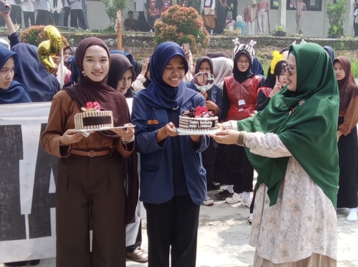‎Caption : Kepsek SMAN 1 Cimarga, Dini Fitria Tengah Menerima Kue Ulang Tahun dari Siswa