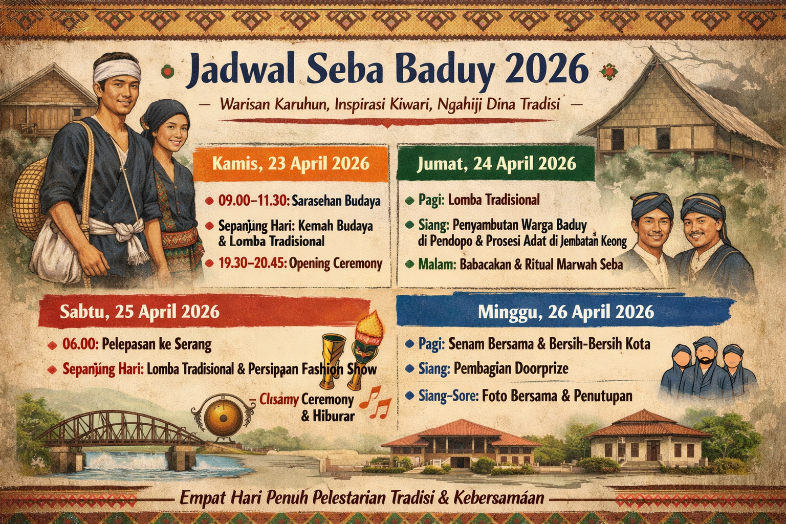 JUARAMEDIA, LEBAK – Pemerintah Kabupaten Lebak resmi menetapkan jadwal pelaksanaan Seba Baduy 2026 yang akan digelar selama empat hari, mulai 23 hingga 26 April 2026, di Alun-alun Rangkasbitung. Tradisi sakral masyarakat adat Baduy ini dipastikan kembali menjadi magnet wisata dengan memadukan prosesi adat, kearifan lokal, dan hiburan rakyat.