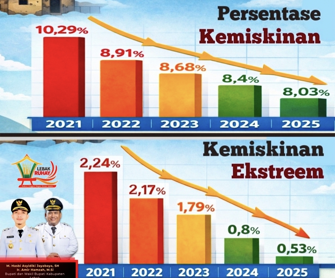 Berdasarkan data Bapperida, tren kemiskinan di Lebak terus menurun sejak 2021 yang berada di angka 10,29 persen. Angka tersebut turun menjadi 8,91 persen pada 2022, 8,68 persen pada 2023, dan 8,4 persen pada 2024, hingga mencapai 8,03 persen pada 2025.