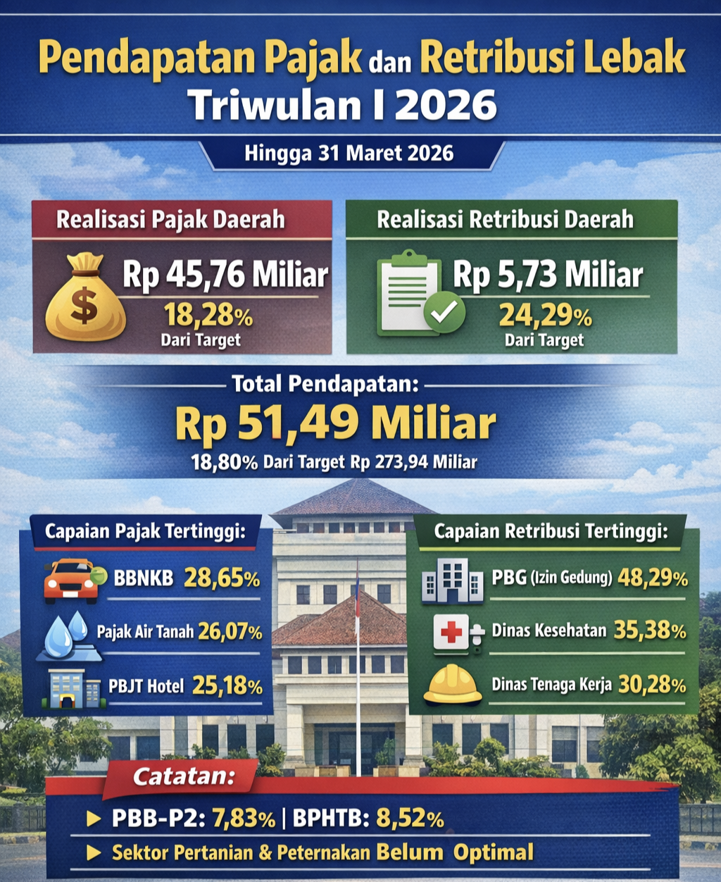 Secara keseluruhan, total pendapatan pajak dan retribusi daerah Kabupaten Lebak hingga 31 Maret 2026 mencapai Rp51,49 miliar atau 18,80 persen dari total target Rp273,94 miliar.